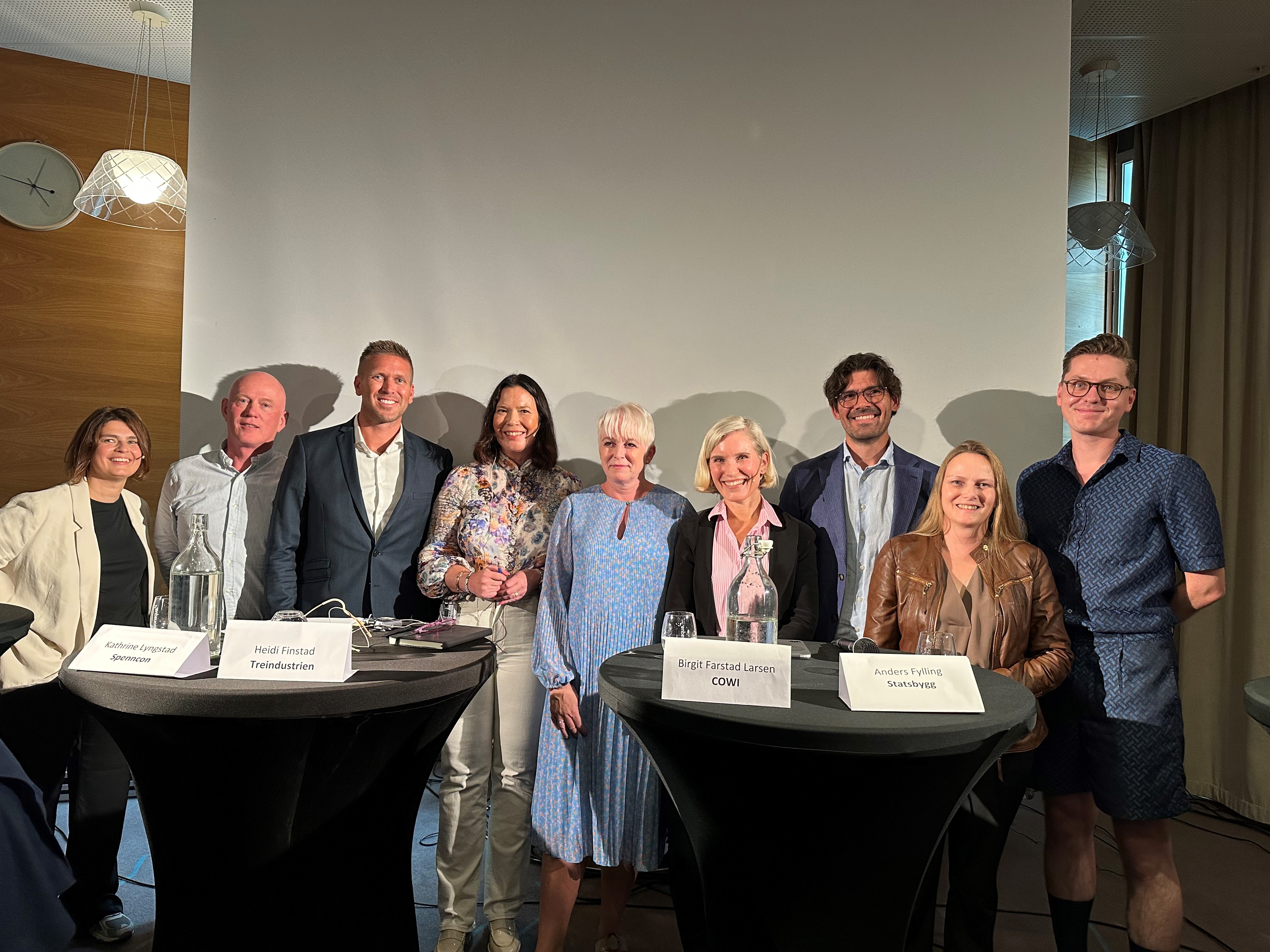 Fra venstre: Maria Nakken (ordstyrer), John-Erik Reiersen (Betong Norge), Børre Lobekk (Nordic Steel Group), Kathrine Lyngstad (Spenncon), Heidi Finstad (Treindustrien), Birgit Farstad Larsen ( COWI), Anders Fylling (Statsbygg) Linda Monsen Merkesdal (Arbeiderpartiet) og Herman Søndenaa (Miljøpartiet De Grønne).