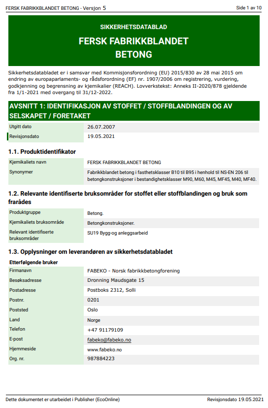 9. Forsiktighetsregler ved håndtering av fersk betong