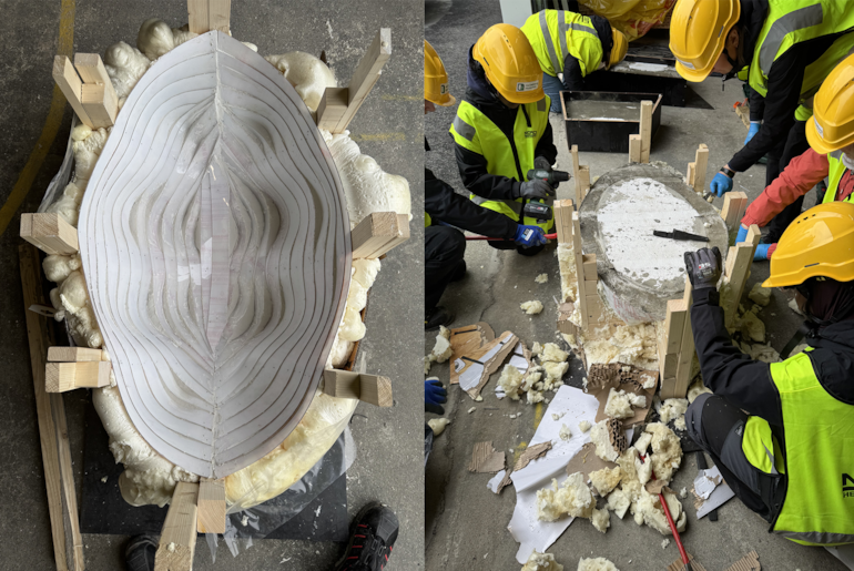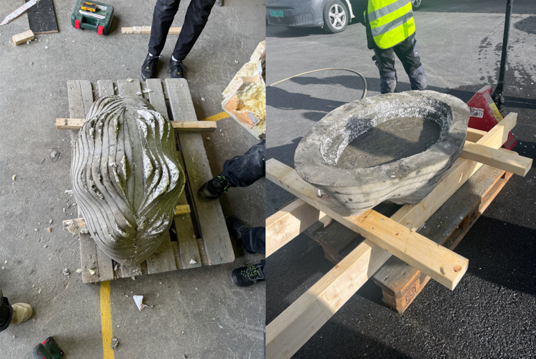 Studentene hos Heidelberg Materials lagde et fuglebad i form av en båt. Denne skal leveres til en barnehage i Trondheim. Bildene viser prosessen med forskaling og avforming. Foto: Betong Norge