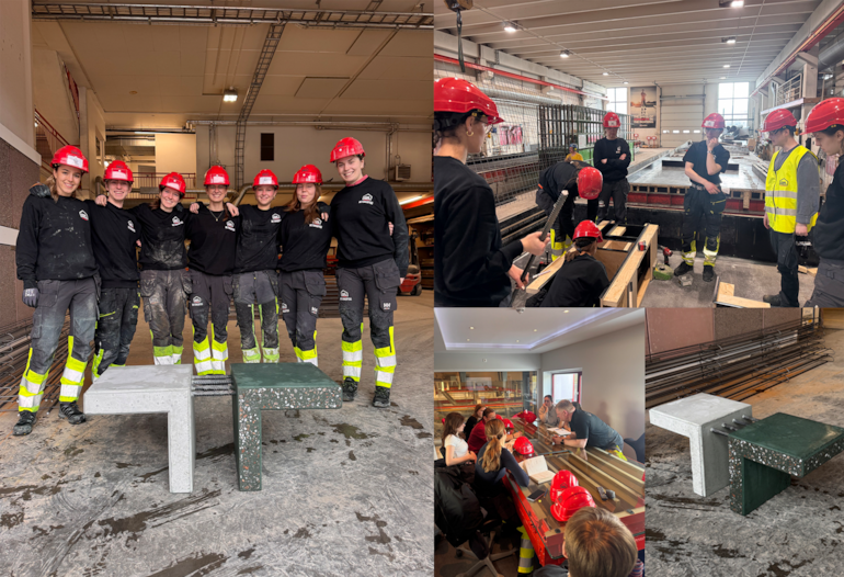 Lærekurven er bratt når førsteårsstudentene på arkitektstudiet ved NTNU kaster seg ut i betongprosjekter. Gjennom en praksisperiode hos lokale betongbedrifter fikk studentene jobbe tett på materialet i produksjon hos Overhalla Betongbygg og Heidelberg Materials.