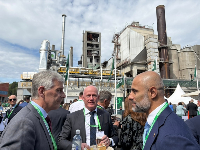 John-Erik i samtale med stortingspolitiker Mahmoud Farahmand (H) under åpningen av Heidelberg Materials CCS-anlegget i Brevik i juni.